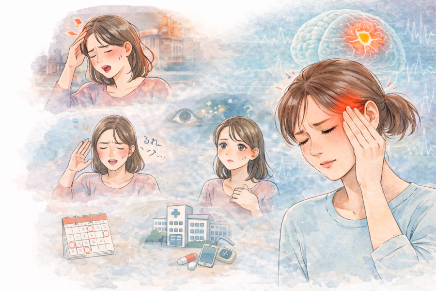 まず気をつけたいのは、「こんな痛みは初めて」と感じるレベルの強い頭痛です。急にガツンとくるような激しい痛みや、短時間で一気に悪化する頭痛は、普段の片頭痛や肩こり由来の不調とは違う見方が必要になると言われています。参考記事でも、毎日続く痛みや強い違和感は早めに対応したほうがよいと示されています。いつもの頭痛パターンから外れているなら、無理に仕事や家事を続けるより、早めに相談先を考えることが大切です。