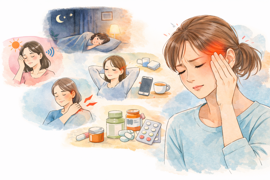 一方で、ズキズキというより「締め付けられる」「重だるい」「ずっと鈍く続く」といった感覚なら、緊張型頭痛も考えられると言われています。緊張型頭痛は、ストレス、睡眠不足、眼精疲労、首やあごの痛みなどが引き金になることがあるようです。デスクワークやスマホ時間が長い方で、肩こりや首こりが強いなら、こちらの特徴に近づきやすいとも考えられています。「頭だけ」というより、首から上が全体に張っている感じがあるときは、このタイプも見ておきたいところです。
