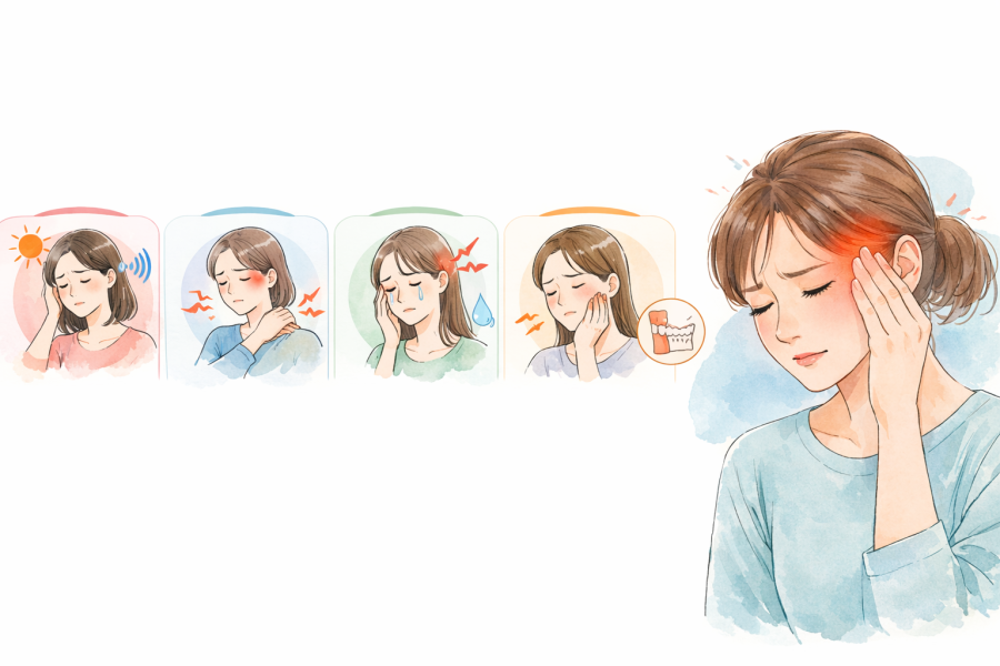 fd8068d5-962b-4d7a-a649-4f9c689f3b1e「こめかみ 痛い 左」とひとことで言っても、見分けるときは“痛む場所”だけでは足りないと言われています。大事なのは、光や音がつらいのか、首や肩がガチガチなのか、目の奥まで響くのか、噛む動作で変わるのか、といった周辺のサインです。参考記事でも、こめかみの痛みには片頭痛、緊張型頭痛、群発頭痛、さらに歯ぎしりや食いしばりなど、いくつかの要因が関わる可能性があると紹介されています。つまり、「左だけ痛い=これ」とすぐ決めるのではなく、症状の組み合わせで見ていくことが大切だと考えられています。