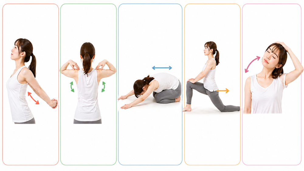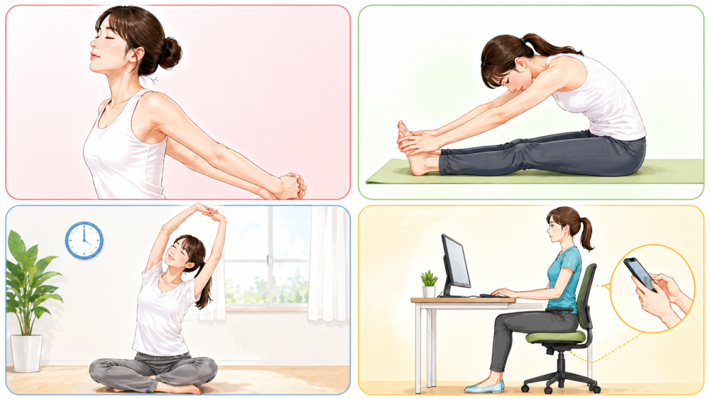ストレッチをしても、日常の姿勢が崩れたままだと、同じクセに戻りやすいと言われています。たとえば、スマホを見るときに首を下げすぎない、デスクワークでは画面の高さを調整する、長時間同じ姿勢を続けないなど、小さな工夫が大切です。1時間に1回立ち上がる、肩を回す、深呼吸をするだけでも、体をリセットしやすくなります。習慣を変えることも姿勢ケアの一部です。