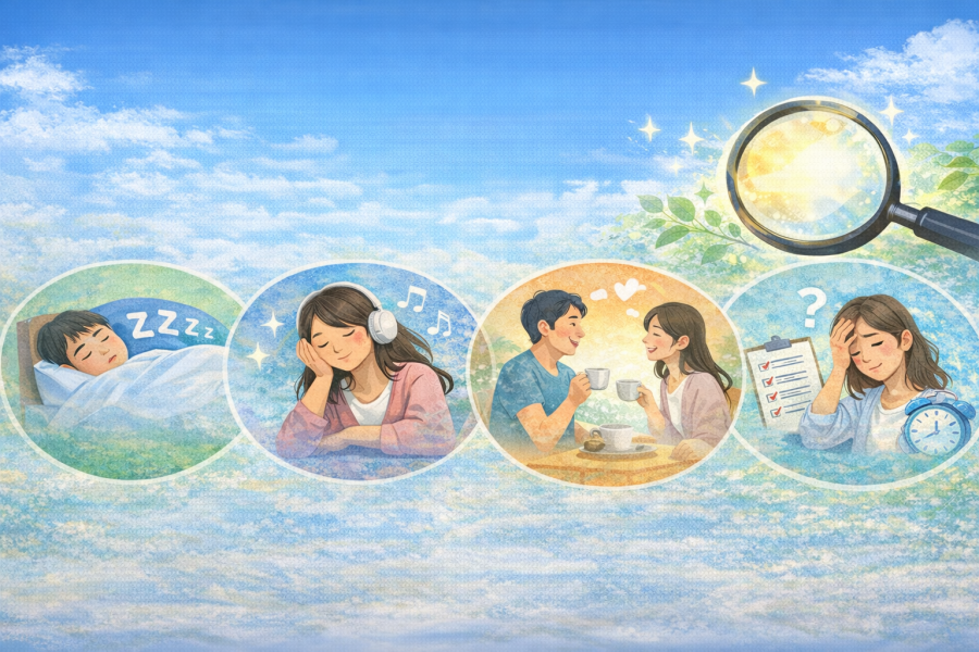 たとえば、眠気やだるさが強いなら休息や睡眠の見直し、頭が張る感じや気持ちの余裕のなさがあるなら気分転換や環境調整が合う場合があります。花王のレポートでも、7つの休養タイプを知る目的は分類そのものではなく、自分にとっての休養に気づくことだと説明されています。休養の取り方で迷ったときは、「今の自分は何に消耗しているのか」と立ち止まって考えることが、遠回りに見えて実は近道です。