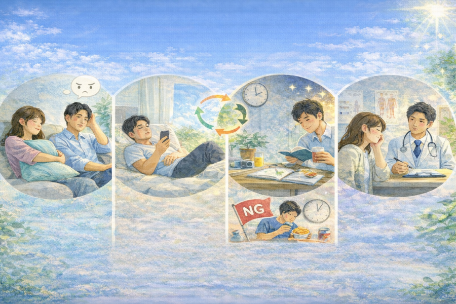睡眠の質を高めたいときは、寝る直前だけでなく、日中からの生活習慣を整えることが大切だと言われています。厚生労働省の睡眠ガイドでは、睡眠は健康の維持に欠かせない休養活動とされており、量だけでなく質も重要です。自治体の睡眠情報でも、寝る1時間前から強い光を避けること、平日と休日の起床時刻を大きくずらさないこと、夕方以降のカフェインを控えること、就寝の1〜2時間前の入浴などが紹介されています。毎日完璧にそろえようとしなくても、ひとつずつ整えることで眠りやすさは変わっていくと考えられています。