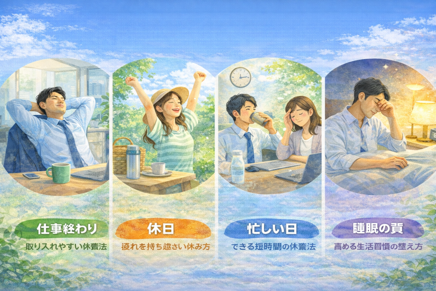 休養の取り方は、いつでも同じでよいわけではないと言われています。参考記事でも、休養は生理的・心理的・社会的な方向から考えられ、疲れ方に応じて選ぶことが大切だと紹介されています。つまり、仕事終わりと休日では合う休み方が違っても不思議ではありません。さらに、公的情報でも、休養は「ただ休むだけ」でなく、鋭気を養い、生活にめりはりをつける意味合いがあると案内されています。場面に合わせて休み方を変える視点を持つと、休んだあとの感覚も変わりやすいようです。
