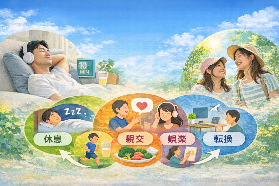 社会的休養は、今いる場所や役割、空気感から少し離れて、負担のかかり方を変える考え方だと言われています。参考記事では、このタイプを転換として紹介しています。たとえば、仕事のオン状態が続いている人がスマホから離れる、いつもの空間を出て自然のある場所に行く、ひとり時間をつくる。逆に、孤独感が強い人は信頼できる人と話すことで楽になることもあります。つまり、社会的休養は「誰と、どこで、どんな役割で過ごすか」を整える視点とも言えそうです。