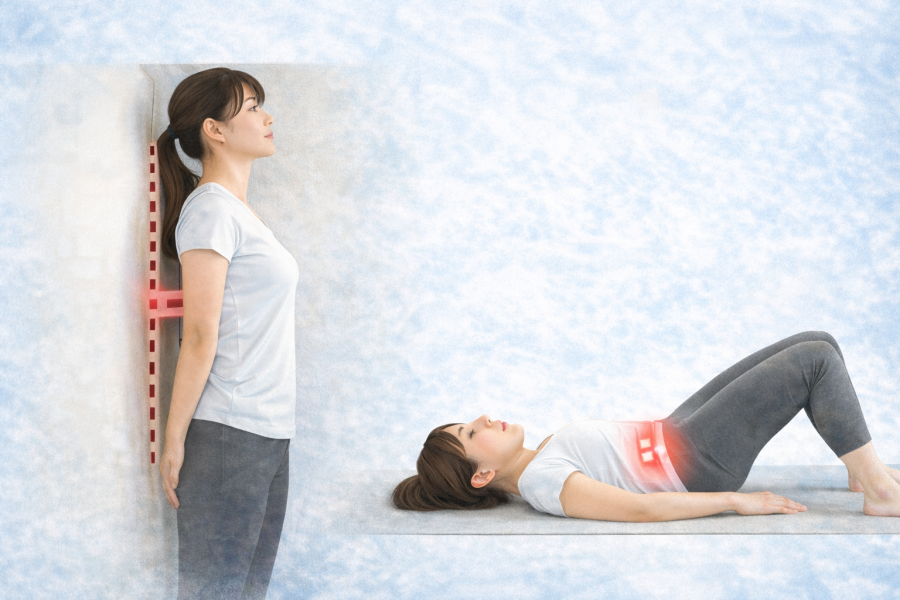 「自分は反り腰かも」と感じたら、まずは壁立ちで姿勢を見てみる方法があります。やり方は、かかと、お尻、背中を壁に近づけて自然に立ち、腰と壁のすき間を確認する流れです。参考記事では、反り腰は背骨の自然なS字カーブが強くなり、腰への負担が大きくなる姿勢として紹介されています。横から見たときにお尻が突き出る反り腰では、骨盤が前傾していると説明している病院情報もあります。壁との距離が極端に空く、胸を張らないと立ちづらい、といった感覚がある場合は、ひとつの目安になると言われています。