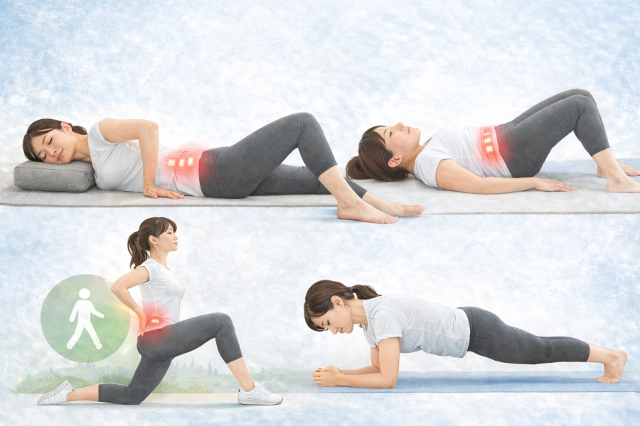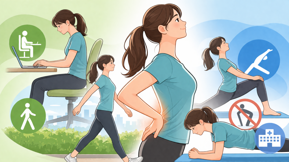 ただ、ゆるめるだけでは姿勢が安定しにくい場合もあると言われています。そこで次に意識したいのが、支える筋肉を使いやすくすることです。参考記事では、反り腰の状態では筋肉の使われ方に偏りが出やすく、お腹やお尻の筋肉が使われにくくなることがあると紹介されています。Cleveland Clinicでも、骨盤まわりの筋肉はストレッチだけでなく、強化も組み合わせることが役立つと案内しています。会話でいうなら、「前側をゆるめて、後ろと体幹で支える形に近づける」という流れです。腹筋群や大殿筋、太ももの裏を少しずつ使えるようにすると、骨盤の位置を保ちやすくなると考えられています。