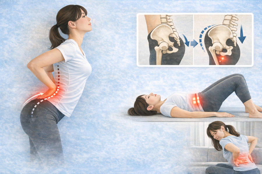 ここでよく出てくるのが「骨盤前傾」です。骨盤が前に傾くと、連動するように腰の反りが強くなりやすいと言われています。総合大雄会病院の解説でも、横から見たときにお尻が突き出た反り腰では、骨盤が前傾していると説明されています。つまり、反り腰と骨盤前傾は切り分けて考えるより、セットで理解したほうがわかりやすいです。