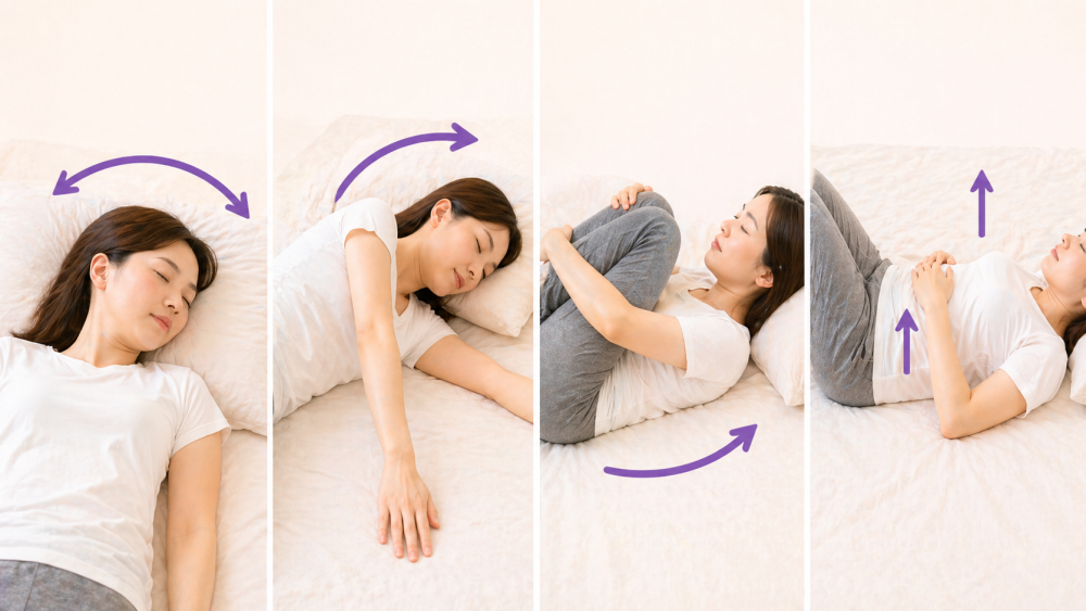 「仰向けなら、ただ寝ればいいの?」と思うかもしれません。基本は、膝を軽く立てて腰や背中の緊張を抜き、首や肩に余計な力が入らない姿勢がよいと言われています。横向きで行う場合は、枕の高さを調整して首が傾きすぎないようにし、上側の腕を前に出すと胸や背中を伸ばしやすいでしょう。呼吸筋ストレッチを寝ながら始めるなら、まず「がんばらなくても呼吸できる姿勢」を探すのがポイントです。