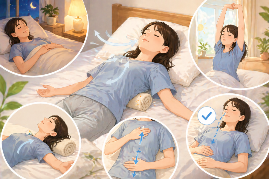呼吸筋ストレッチを寝ながら行うなら、いきなり大きく体を伸ばすより、首、胸、背中、横隔膜の順番でゆっくり整える流れが取り入れやすいと言われています。「何から始めたらいいの?」という方は、ベッドや布団の上で、呼吸を止めずにできる動きから試してみましょう。大切なのは、強く伸ばすことではなく、「息が入りやすいな」と感じる範囲で行うことです。
