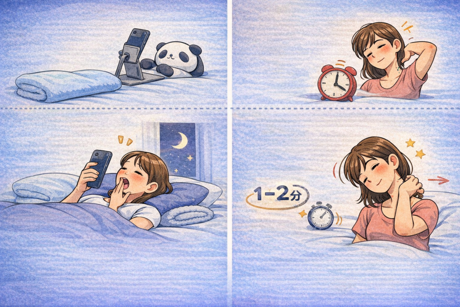 「寝ながらスマホ 正しい姿勢」を意識していても、姿勢だけで負担をゼロにするのは難しいと言われています。だからこそ大事なのは、体勢そのものだけでなく、道具の使い方や見る時間、見終わったあとの過ごし方まで含めて整えることです。参考記事でも、寝ながらスマホは首の湾曲が失われやすく、首や肩の筋肉を不自然に緊張させる一因になると紹介されています。そこでまず意識したいのが、枕やクッションで首・腕の支えを増やすことです。さらに、手で持ち続ける負担を減らすために、スマホスタンドを使って目線に近い位置へ調整する工夫も役立つと言われています。加えて、長時間の固定姿勢はこわばりにつながりやすいため、20〜30分ごとにいったん区切る考え方も大切です。就寝前のスマホ使用は、画面の光によって寝つきや睡眠の質に影響する可能性も指摘されているため、寝る直前まで見続けない工夫も意識したいところです。見終わったあとに首や肩を軽く動かして、同じ姿勢で固まりやすい部分をゆるめることも、無理なく続けやすいセルフケアのひとつと言われています。