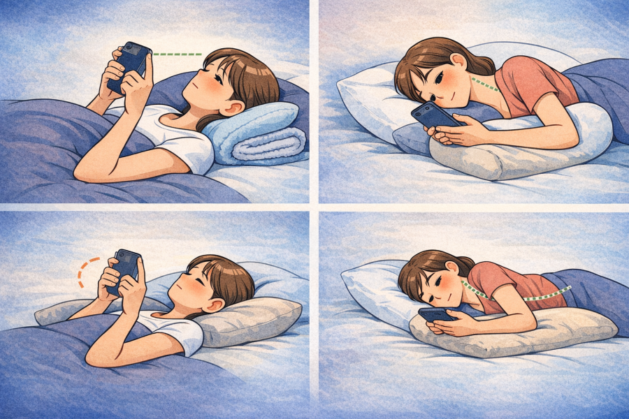 「寝ながらスマホ 正しい姿勢」と聞くと、特別な形を作らないといけないと思うかもしれません。ですが実際は、難しく考えすぎず、首・肩・腕に負担が偏りにくい形を意識することが基本だと言われています。参考記事でも、寝ながらスマホは首の自然なカーブが崩れやすく、姿勢や使い方に注意が必要と紹介されています。では何を意識すればいいのかというと、まずは画面をなるべく目線に近づけることです。顔を画面に近づけるのではなく、スマホの位置を調整して、首を深く曲げすぎない形を作るのがポイントとされています。さらに、首だけで支えず、枕やクッションを使って頭や腕の支点を増やすと、余計な緊張を減らしやすいようです。仰向けなら腕の下にクッションを入れる、横向きなら頭の高さを合わせる、といった工夫も紹介されています。加えて、腕をずっと持ち上げたままにしないことも大切です。手首を固めたまま長く使うと、肩から前腕まで疲れがたまりやすいと言われています。もうひとつ意識したいのが、あごを前に突き出しすぎないことです。あごが出ると首の前側と後ろ側のバランスが崩れやすく、体のねじれも強まりやすいとされています。寝ながらスマホ 正しい姿勢は、完璧な形を保つことよりも、無理の少ない体勢を作ってこまめに崩すことが大事、と考えるとわかりやすいです。