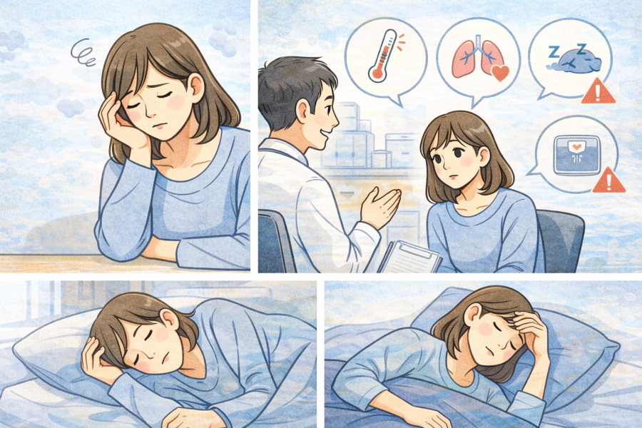 しっかり寝ているはずなのに疲労が取れない場合、睡眠の質に影響する状態が隠れていることもあると言われています。例えば、睡眠中に呼吸が浅くなることで、十分に休息が取れていないケースもあるとされています。いびきや日中の強い眠気がある場合は、一つの目安になると考えられています。