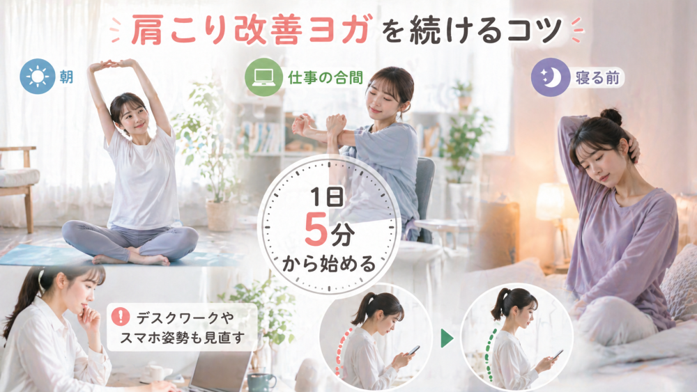 最初から30分やろうとすると、忙しい日は負担になりがちです。「今日はキャット&カウだけ」「寝る前にチャイルドポーズだけ」でもかまいません。1日5分ほどから始めると、肩こり改善ヨガを生活に入れやすくなります。参考記事でも、肩甲骨や胸まわりを動かすポーズが肩こり対策として紹介されています。