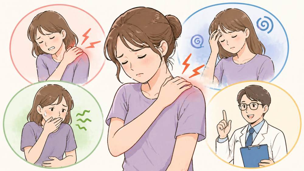 肩や首を動かしたときに強い痛みが出る、腕や手にしびれがある、力が入りにくい。このような場合は、単なる肩こりだけではなく、首まわりの神経や関節が関係していることもあると言われています。ポーズで伸ばしてごまかすより、まずは状態を確認する意識を持ちましょう。