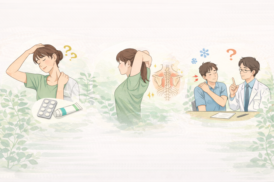 「肩こり 対処法って、結局どれを選べばいいの?」と迷うこと、ありますよね。つらいときほど、マッサージがいいのか、市販薬を使うべきか、ストレッチをしたほうがいいのか判断しづらいものです。参考記事では、肩こりは姿勢や眼精疲労、運動不足、ストレスなどが重なって起こりやすいと紹介されています。そのため、ひとつの方法だけで考えるより、今の不調に合ったやり方を選ぶ視点が大切と言われています。また、肩こりだと思っていても、四十肩・五十肩や首の不調が関係している場合もあるようです。だからこそ、「なんとなくいつも通り」で済ませず、違いを知っておくことが肩こり 対処法では欠かせないポイントになります。ここでは、迷いやすい点を会話するように整理していきます。