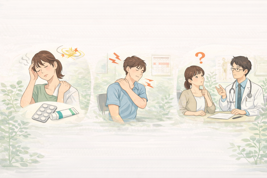 ここはかなり大事なポイントです。肩こりはよくある不調と言われていますが、頭痛、めまい、吐き気、手や腕のしびれ、強い痛みなどを伴うときは、筋肉のこり以外も含めて考えたほうがよい場合があるようです。いつもの肩こりと違って、片側だけ極端につらい、安静にしていても強く気になる、といったときも注意が必要と言われています。無理に自己判断せず、気になるサインがあるときは早めに相談先を考えることが大切です。