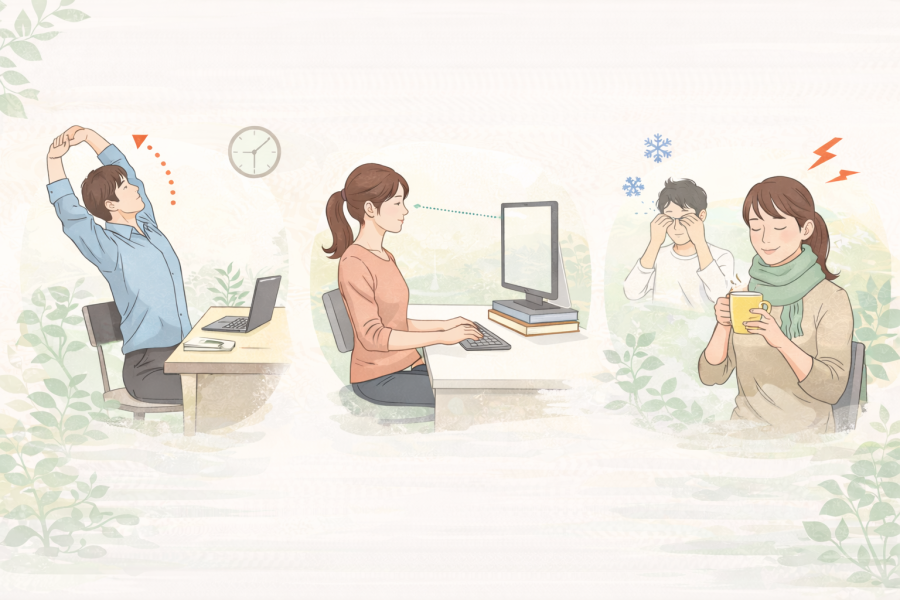 肩こりというと姿勢ばかり気になりがちですが、実はそれだけではないようです。参考記事では、眼精疲労やストレスも肩こりに影響を与える要因として挙げられています。目が疲れると、その緊張が首や肩まわりにも伝わりやすいと言われていますし、ストレスが続くと体が無意識に力みやすくなることもあるようです。また、冷えも筋肉のこわばりにつながる場合があるため、エアコンの風が直接当たりにくい工夫や、首元を冷やしすぎない意識も役立つと言われています。目をこまめに休める、深呼吸をする、温かい飲み物で一息つく。そんな小さな習慣の積み重ねも、肩こり 対処法のひとつとして考えられています。