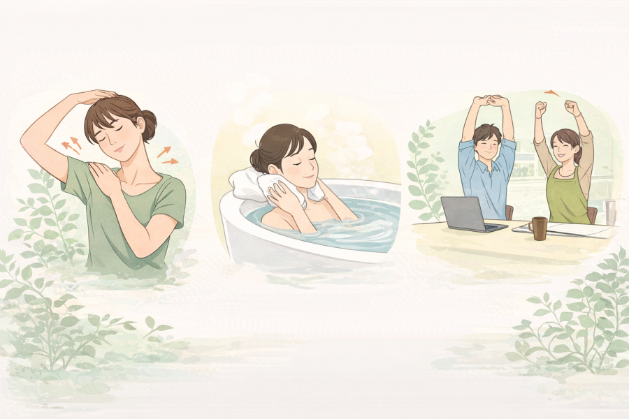 肩こり 対処法として、温めるケアを思い浮かべる方も多いですよね。実際、肩や首まわりを温めることで血行がよくなり、筋肉の緊張がやわらぎやすくなると言われています。参考記事では、38〜40℃くらいのお湯にゆっくりつかる方法が紹介されていました。忙しい日は、蒸しタオルを首や肩に当てるだけでも取り入れやすいでしょう。冷えを感じやすい方は、エアコンの風が直接当たらないようにしたり、首元を冷やしにくい服装を意識したりするのも一つの考え方です。ただし、熱すぎる温め方は負担になることもあるため、心地よいと感じる程度を目安にすると続けやすいようです。
