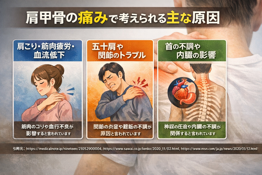肩甲骨の痛みというと、「骨が悪いのかな」と思いやすいですよね。ですが、実際には肩甲骨そのものより、まわりの筋肉や肩関節、首の不調などが関係していることがあると言われています。参考記事でも、肩甲骨まわりの違和感は一つの原因だけで決まるとは限らず、動き方や体の使い方の影響も受けやすいと紹介されています。だからこそ、肩甲骨 痛みを考えるときは、表面のつらさだけでなく「どこから負担が来ているか」を整理してみることが大切と言われています。