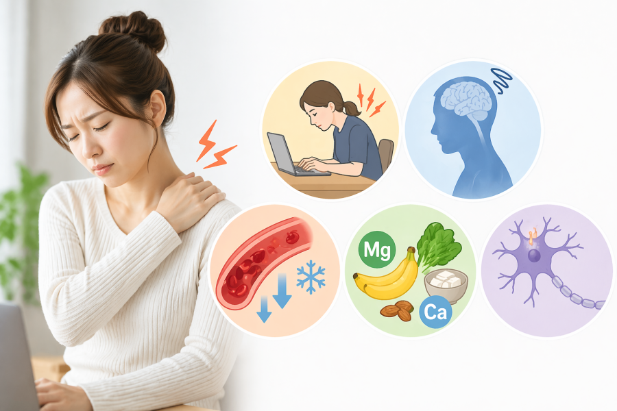 実はここも見落としがちなポイントです。筋肉の働きにはマグネシウムやカルシウムが関係しているため、不足するとピクピクしやすくなることがあると言われています。