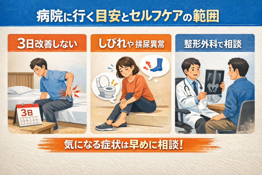 腰の痛みだけなら様子を見られることもありますが、しびれや脚の力の入りにくさがあるときは、少し見方が変わると言われています。さらに、尿が出にくい、残っている感じがする、便の感覚がいつもと違うといった排尿・排便の異常がある場合は、早めの相談が大切とされています。腰痛のガイドラインや医療機関の説明でも、明らかな筋力低下や膀胱・直腸の機能異常は見逃したくないサインとして挙げられています。こうした症状があるときは、「そのうち改善するかも」と我慢するより、早めに医療機関へつながることが重要と言えそうです。痛みの強さだけで判断せず、脚の感覚やトイレの変化まで含めて見ることがポイントと考えられています。