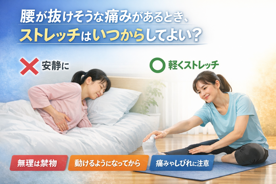 では、いつから動いてよいのかというと、ひとつの目安は「寝返りがしやすくなった」「ゆっくりなら歩ける」と感じる頃だと言われています。参考記事では、通常は2〜3日ほど安静にしているうちに少しずつ痛みがやわらぎ、腰を動かせる程度になってきたら、軽いストレッチへ移っていく流れが紹介されています。ここで大事なのは、いきなりしっかり伸ばそうとしないことです。「ちょっと体を動かしてみようかな」くらいの感覚で、呼吸を止めず、無理のない範囲から始めるのがよいようです。腰が抜けそうな痛み ストレッチを考えるときほど、頑張るより様子を見ながら進める姿勢が大切だと考えられています。