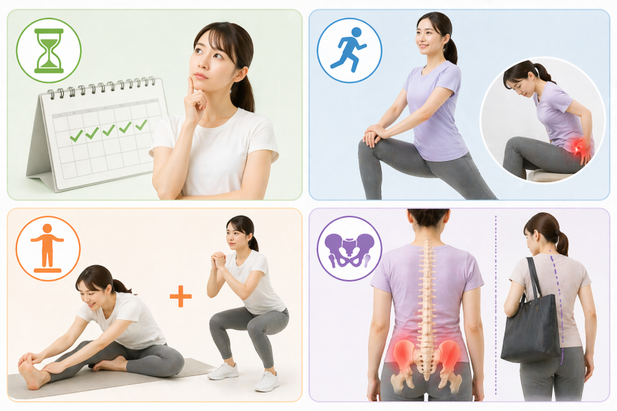 「ストレッチだけじゃダメ?」という疑問、けっこう多いです。結論としては、筋肉を支える力も重要だと言われています。特に体幹やお尻の筋肉(臀筋)は、腰と股関節の安定に関わるとされています。弱いままだと、せっかく柔らかくしても負担が戻りやすいそうです。ただし、いきなりハードにやる必要はなく、軽めのトレーニングからで十分と言われています。「整える+支える」をセットで考えると、より安定しやすい流れになります。