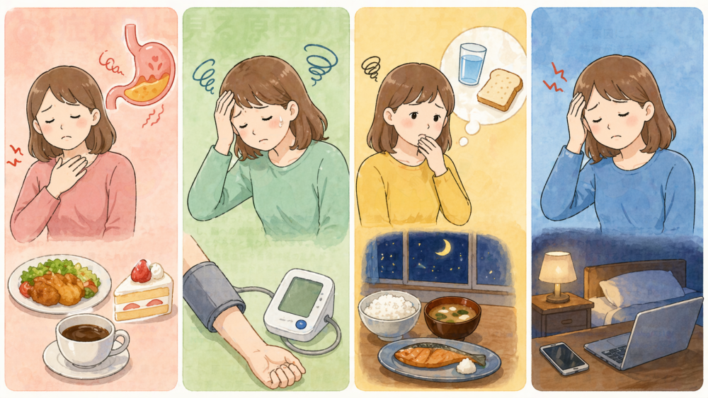 「起きると吐き気 寝ると楽」に加えて、胸やけや喉のイガイガ感がある場合は、胃酸の逆流が関係することもあると言われています。特に、夕食が遅い日や脂っこい食事をした翌朝にムカムカしやすい人は、胃もたれや逆流性食道炎の可能性も考えられます。寝ている間は気づきにくくても、起き上がった瞬間に違和感が出ることもあるようです。
