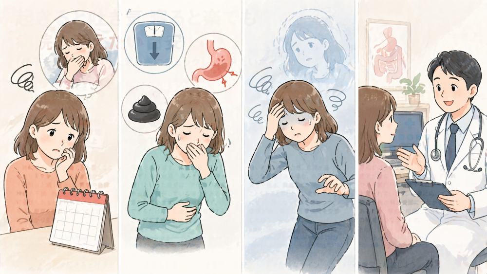 「少し休めば楽になるから大丈夫」と考えたくなるところですが、吐き気が何日も続く、嘔吐をくり返す、強い腹痛やめまいを伴う場合は、自己判断だけで済ませないほうが安心です。まずは症状が出る時間帯、食事内容、睡眠、ストレスの状態をメモしておくと、来院時にも伝えやすくなります。