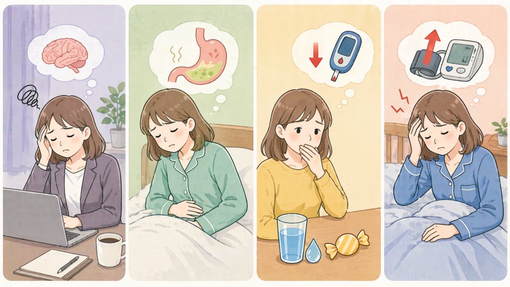 頭痛や首こり、寝不足があるときの吐き気は、首肩まわりの緊張や自律神経の負担が関係することもあると言われています。長時間のスマホ、枕の高さが合わない、眠りが浅いといった習慣が続くと、朝に頭が重く感じる人もいます。「胃だけの問題かな?」と決めつけず、睡眠環境や姿勢も見直してみましょう。強い頭痛やしびれ、嘔吐を伴う場合は、早めに医療機関へ相談したほうが安心です。